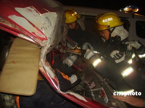 12月24日,山東棗莊發(fā)生一起兩車追尾事故。當(dāng)?shù)叵乐ш犔厍谥嘘牻拥綀缶,派?2名消防官兵、一輛搶險救援車和一輛水罐車。經(jīng)過近半個小時施救,2名被困人員成功獲救。中新社發(fā) 季龍 攝
