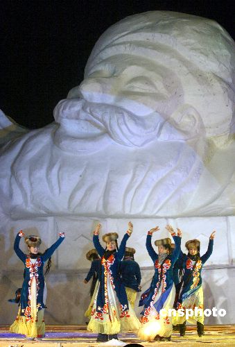 圖為在巨型雪雕“快樂(lè)的阿凡提”前,維吾爾族舞蹈演員跳起少數(shù)民族舞蹈。