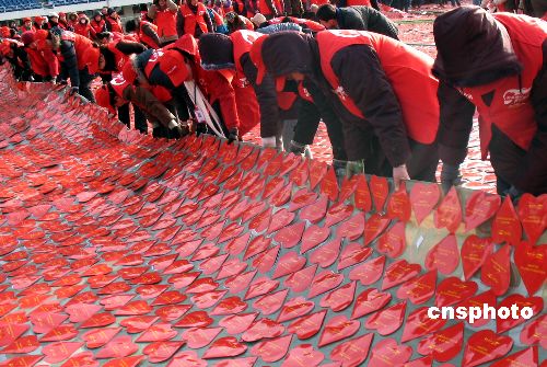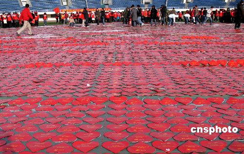 十二月二十九日,一個(gè)名為“共享健康·愛(ài)心接力”大型公益活動(dòng)在北京奧體中心體育場(chǎng)和廣州奧體中心體育場(chǎng)同時(shí)展開(kāi)。一千位來(lái)自中國(guó)各地的老人作為“愛(ài)心大使”,把載滿愛(ài)心故事的十萬(wàn)顆小紅“心”貼成兩顆巨大的“愛(ài)心”,以沖擊吉尼斯世界紀(jì)錄。中新社發(fā) 黎仲顏 攝