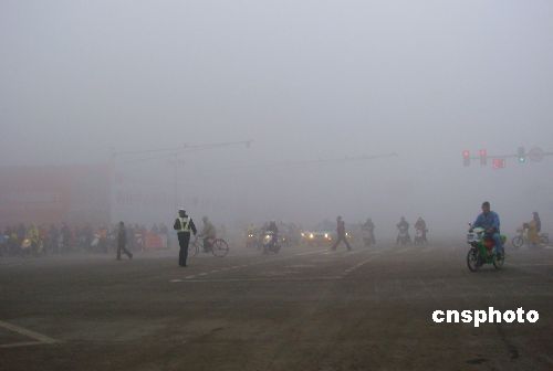 2008年1月7日,江蘇連云港遭遇大霧天氣,能見(jiàn)度不足50米,市民們謹(jǐn)慎出行。“三九”前夕,連云港最高溫度達(dá)到12℃,一直保持升高回暖的態(tài)勢(shì),極易形成大霧天氣。中新社發(fā) 耿玉和 攝