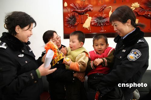 1月10日,沈陽(yáng)市公安局社區(qū)警務(wù)支隊(duì)民警到市兒童福利院為無(wú)戶(hù)口的31名棄嬰解決戶(hù)口問(wèn)題,并送去落戶(hù)手續(xù)。社區(qū)警務(wù)支隊(duì)的民警還為孩子們送去了精心選購(gòu)的各種禮物。這些被遺棄的孤兒,多數(shù)無(wú)法查找到他們的身源,沒(méi)有戶(hù)口就如沒(méi)有一個(gè)合法的公民身份。為了不影響這些孩子今后的成長(zhǎng)、生活、學(xué)習(xí)、就業(yè)。沈陽(yáng)市公安局社區(qū)警務(wù)支隊(duì)采取特事特辦的方式,解決棄嬰們的后顧之憂(yōu)。到目前為止已為263名棄嬰辦理了落戶(hù)。中新社發(fā) 黃金昆 攝