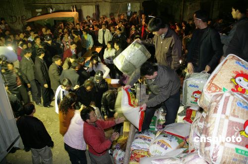 圖為一月十四日晚,惠州市為災(zāi)民發(fā)放慰問品現(xiàn)場。一月十三日上午,在廣東惠州市區(qū)河南岸街道辦事處河南岸村渡船頭村民小組面積過萬平方米的一片棚屋發(fā)生火災(zāi),造成三百多名來自河南、安徽等地的種菜和收廢品的外來民工受災(zāi)。火災(zāi)發(fā)生后,惠州市委、市政府和惠城區(qū)委、區(qū)政府以及河南岸辦事處立即妥善安置了災(zāi)民的生活。中新社發(fā) 宋秀杰 攝