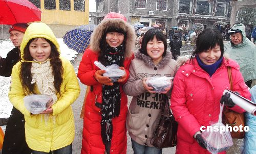 1月15日上午9時,江蘇揚州大明寺臘八節(jié)放粥送福發(fā)放處,近千市民冒雪排長隊領(lǐng)取免費臘八粥和“!弊。當(dāng)日清晨5時,該寺廟開始放粥送;顒。中新社發(fā) 范友林 攝