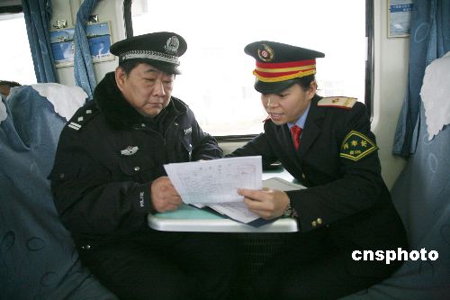 圖為南昌鐵路局N527/N528次列車列車長(zhǎng)王水英與乘警長(zhǎng)陳曉波十六日在行駛的列車上抓緊研究春運(yùn)治安方案。