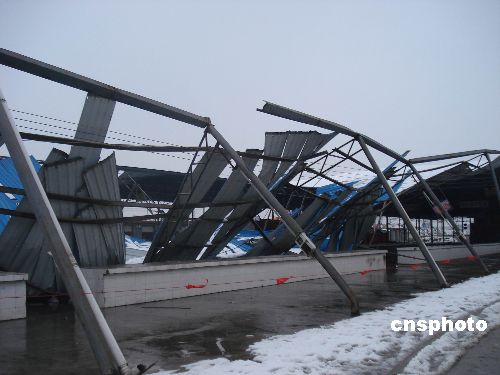 2008年1月20日凌晨,由于連日的暴雪,導(dǎo)致安徽省合肥市包河苑農(nóng)貿(mào)市場(chǎng)上千平方米蔬菜大棚被雪壓塌。由于連降暴雪,安徽合肥等地,不少工廠倉庫和農(nóng)貿(mào)市場(chǎng)的簡(jiǎn)易大棚被雪壓塌,目前沒有造成人員傷亡。中新社發(fā) 何保豐 攝
