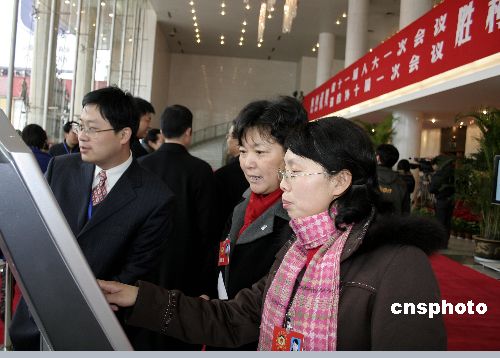 圖為政協(xié)委員在自助機(jī)前查詢(xún)大會(huì)相關(guān)資料。