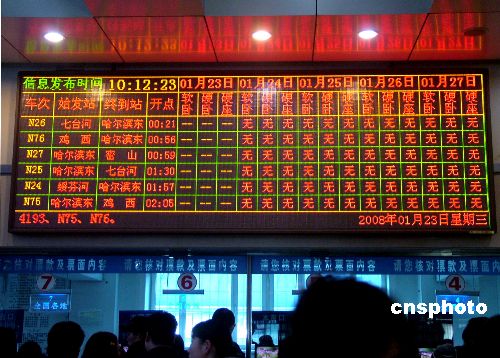 1月23日,黑龍江牡丹江2008年春運工作正式啟動。黑龍江省境內(nèi)途經(jīng)牡丹江的部分短途列車,出現(xiàn)10天內(nèi)無票可售的局面。中新社發(fā) 莊文斌 攝