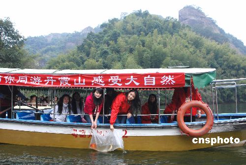 一月二十四日,新膺世界小姐中國姑娘張梓琳在世界地質公園廣東丹霞山翔龍湖放生鯉魚。是日,張梓琳在丹霞山踐行她任期內的環(huán)保宣傳。中新社發(fā) 馮昶 攝