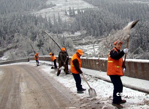 1月24日,四川瀘州敘永道班工人正在321國道上清掃積雪,確保道路暢通。受冷空氣影響,該縣南面鄉(xiāng)鎮(zhèn)普遍遭受15年不遇的冰雪災害襲擊,全縣12個鄉(xiāng)鎮(zhèn)、25萬人受災。該縣境內(nèi)321國道等4條國、省道共59公里路段因路面結冰而封閉,11個鄉(xiāng)鎮(zhèn)因冰雪壓斷電線、電桿而停電。災情發(fā)生后,該縣成立指揮部組織抗災救災工作。據(jù)氣象部門預測,冰雪低溫天氣還將持續(xù)一周左右,災情仍在持續(xù)。中新社發(fā) 黃虎 攝
