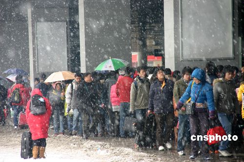 2008年1月26日,南京出現(xiàn)入冬以來最大幅度的降溫和雨雪天氣,受通往外地的高速公路全部關(guān)閉的影響,南京火車站迎來春運(yùn)以來的最大客流量,前來購(gòu)票的旅客一直排到站外廣場(chǎng),交警和武警官兵也協(xié)助車站方面維護(hù)秩序。中新社發(fā) 阿董 攝