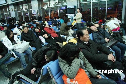 1月27日消息,1月13日以來,湖南省遭遇1954年以來,50年不遇的、持續(xù)時(shí)間最長、氣溫最低的冰凍天氣,長沙機(jī)場受冰雪天氣影響,飛機(jī)跑道結(jié)冰,導(dǎo)致大面積航班取消或延誤,25日當(dāng)晚19點(diǎn)15分機(jī)場開始關(guān)閉,場內(nèi)2000多名已辦登機(jī)手續(xù)或途經(jīng)此中轉(zhuǎn)的返鄉(xiāng)乘客滯留在候機(jī)廳內(nèi)。中新社發(fā) 蘇巧帥 攝