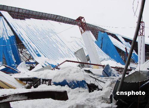 1月28日晨,連續(xù)多日的降雪,使江蘇儀征雪深達20多厘米,厚厚的積雪壓塌了儀征一家具城部分屋頂,幸末有人員傷亡。中新社發(fā) 黃建林 攝
