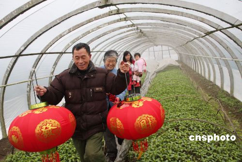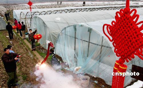1月30日,離春節(jié)僅有一周,江西德興市張村鄉(xiāng)千畝無(wú)公害蔬菜基地的菜農(nóng)們?cè)谠庥隽私衲甏笱┖秃畠龊,在自家的蔬菜大棚掛起了紅紅的中國(guó)結(jié)和燈籠,鳴放鞭炮,呈現(xiàn)一片歡喜和諧的氣氛,給即將到來(lái)的新春佳節(jié)增添了濃濃的喜慶。中新社發(fā) 卓忠偉 攝