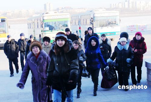 1月31日,大批俄羅斯旅游者進(jìn)入黑河口岸。據(jù)黑河邊檢站披露:自黑龍江冰上汽車運(yùn)輸開始以來(lái),黑河口岸進(jìn)出境旅客達(dá)106000人次,同比增長(zhǎng)45%。黑河口岸2008年實(shí)現(xiàn)首月進(jìn)出境旅客“開門紅”。中新社發(fā) 邱齊龍 攝