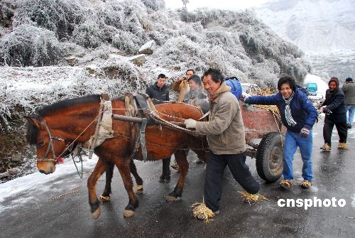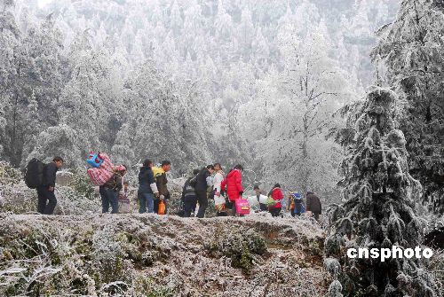 2008年1月31日,在貴陽市海拔二千多米的高坡鄉(xiāng),公路上凝凍有1.5公分厚。許許多多在外打工的農(nóng)民工肩上擔著過年貨,腳下綁扎著稻草,使用各種方法趕路回家。中新社發(fā) 張?zhí)炝?攝