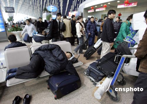 2月2日,上海再遇暴雪,浦東國際機(jī)場春運(yùn)工作受到嚴(yán)重影響。僅2月1日,上海虹橋、浦東兩機(jī)場共延誤二百多個(gè)航班,取消十多個(gè)航班。圖為一位旅客在候機(jī)大廳酣睡。中新社發(fā) 潘索菲 攝