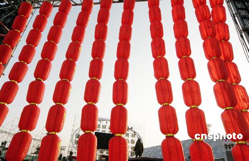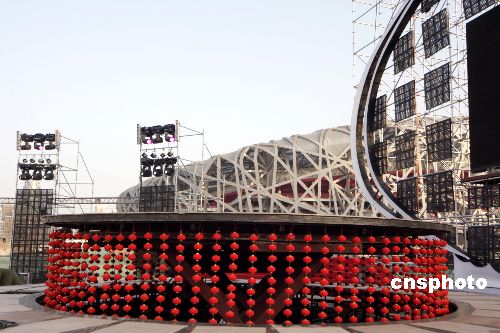 圖:“鳥巢”奧運(yùn)工地掛紅燈籠迎新年