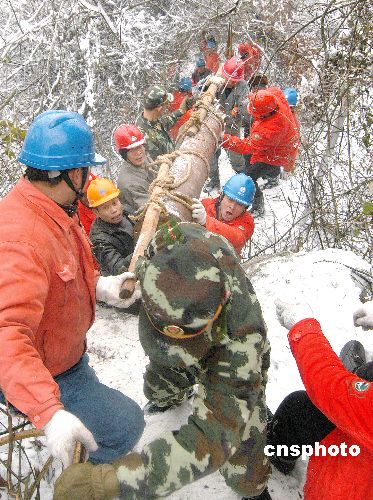 春節(jié)前夕,湖北省黃石市武警支隊(duì)160多名干部戰(zhàn)士與黃石供電公司近千名員工冒雪轉(zhuǎn)運(yùn)鐵塔架。元月29日下午,位于黃石市黃荊山海拔400多米的黃石電廠至西塞山區(qū)石板路的22萬(wàn)伏高壓線(xiàn)路突然斷電,黃石供電公司迅速組織職工查找故障,巡線(xiàn)工人在黃思灣林場(chǎng)附近的一處山頭,發(fā)現(xiàn)該線(xiàn)路19、20、21號(hào)鐵塔嚴(yán)重彎曲,導(dǎo)線(xiàn)已經(jīng)與鐵塔接地。其中20號(hào)鐵塔傾斜達(dá)30度,徹底失去供電能力,受損極其嚴(yán)重。由于受損鐵塔位于較高的山頂,山上積雪達(dá)50厘米,施工環(huán)境十分惡劣,黃石供電公司組織的技術(shù)人員通過(guò)現(xiàn)場(chǎng)實(shí)地調(diào)研后決定,對(duì)兩座傾斜鐵塔進(jìn)行更換,市武警支隊(duì)與搶修人員正全力以赴運(yùn)送15噸的搶修物資上山。中新社發(fā) 邱孝威 攝