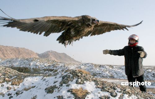 2008年2月2日,新疆哈密地區(qū)野生動植物保護(hù)辦公室的一名工作人員在放飛禿鷲。07年12月初,新疆哈密的一名民工將一只受重傷國家二級保護(hù)動物禿鷲送到新疆哈密地區(qū)野生動植物保護(hù)辦公室進(jìn)行救治。2月2日,完全恢復(fù)健康的禿鷲被放歸大自然。 據(jù)介紹, 禿鷲又名座山雕、狗頭鷲,分布在我國的新疆、青海、甘肅、寧夏、內(nèi)蒙古等地。它們屬于大型猛禽。全長約110厘米。身體的羽毛主要呈黑褐色。主要以鳥獸的尸體和其他腐爛動物為食。中新社發(fā) 普拉提 攝