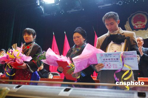 2月4日,貴州省委、省政府召開電視電話會議,表彰抗雪災犧牲在崗位上的民警歐光權。歐光權是貴州省臺江縣看守所民警,在抗雪災一線超負荷工作,1月21日因積勞成疾突發(fā)腦溢血倒在崗位上,經(jīng)搶救無效光榮犧牲,終年57歲。2月2日,公安部部長孟建柱簽署命令,追授歐光權為全國公安二級英模。表彰會上有關領導一次性向歐光權的家屬頒發(fā)獎金21萬元。中新社發(fā) 吳東俊 攝