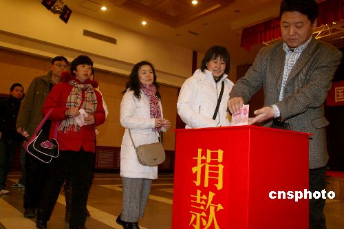 五十年一遇的罕見雪災(zāi)仍舊肆虐著中國(guó)南部的一些省份,為了幫助受災(zāi)地區(qū)群眾抗災(zāi),二月四日,國(guó)務(wù)院僑辦組織自愿捐款活動(dòng),僑辦主任李海峰,副主任許又聲、馬儒沛、任啟亮,中國(guó)海外交流協(xié)會(huì)副會(huì)長(zhǎng)林文肯及僑辦機(jī)關(guān)和直屬單位的領(lǐng)導(dǎo)干部,將一份份“愛心”投入捐款箱中。據(jù)統(tǒng)計(jì),此次捐款活動(dòng)共收到干部捐款和下屬單位捐款二百零六萬二千六百三十元人民幣。中新社發(fā) 張勤 攝