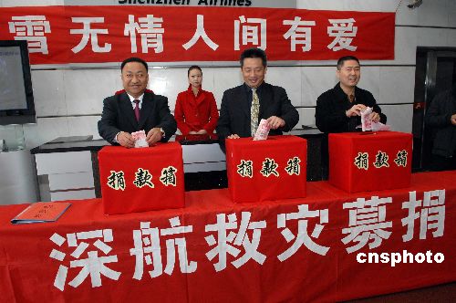 深圳航空公司二月四日發(fā)出緊急倡議,掀起“冰雪無情,人間有愛”賑災(zāi)捐款活動。當(dāng)日下午,僅半小時(shí)首批員工捐款已達(dá)二十余萬元人民幣。深航總裁李昆表示,我們的愛心行動將繼續(xù)開展下去,善款立即定向電匯貴州遵義、安順災(zāi)區(qū)。中新社發(fā) 陳文 攝