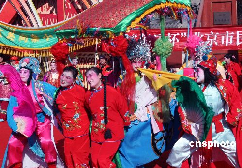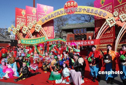 2月6日,“第七屆北京民俗文化節(jié)暨第十屆東岳廟春節(jié)文化廟會(huì)”在喜慶熱烈、歡樂(lè)祥和的氛圍中開(kāi)鑼。東岳廟作為北京奧運(yùn)會(huì)主場(chǎng)館所在地朝陽(yáng)區(qū)唯一的民俗類專題博物館,是次廟會(huì)以“祈福納祥迎奧運(yùn)”為主題,活動(dòng)內(nèi)容精彩紛呈,既有傳統(tǒng)的非物質(zhì)文化遺產(chǎn)展示,亦有新增加的民俗活動(dòng)“請(qǐng)福牌”、“畫福布”、“請(qǐng)五!薄ⅰ皰毂P香”等活動(dòng)。同時(shí)“東岳杯”朝陽(yáng)區(qū)民間花會(huì)大賽的11個(gè)區(qū)縣、32檔花會(huì)也同臺(tái)競(jìng)技。中新社發(fā) 錢興強(qiáng) 攝