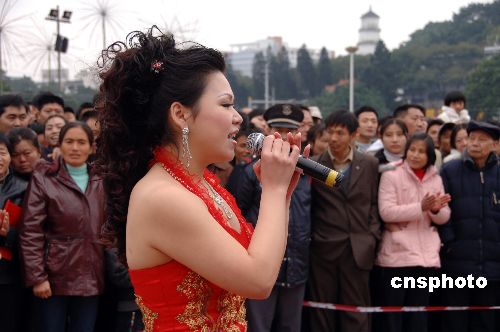 2月8日,福州市文化部門在五一廣場(chǎng)舉行了“榕城祝福”文娛演出,來自山東省的務(wù)工者畢君上臺(tái)表演,祝福留在福州過春節(jié)的外來民工新春愉快。中新社發(fā) 鄭祚聲 攝