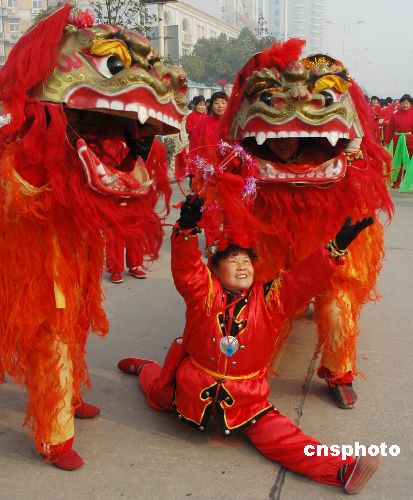 2月7日,舞獅隊(duì)在街頭巡游表演鬧新春。當(dāng)天農(nóng)歷正月初一,安徽蕪湖市社區(qū)居民組成秧歌、龍燈、舞獅、彩船、腰鼓、花籃隊(duì)踏歌踩街巡游表演鬧新春,一路引來眾多游人觀賞。中新社發(fā) 陳立希 攝