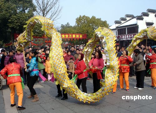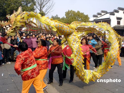 2月8日農(nóng)歷大年初二,一支由蘇州古鎮(zhèn)同里農(nóng)村婦女組成的舞龍表演隊在同里鎮(zhèn)退思廣場上表演,給節(jié)日的古鎮(zhèn)增添了濃濃的喜慶氣氛,吸引了眾多古鎮(zhèn)居民和中外游客觀看。中新社發(fā) 王建康 攝
