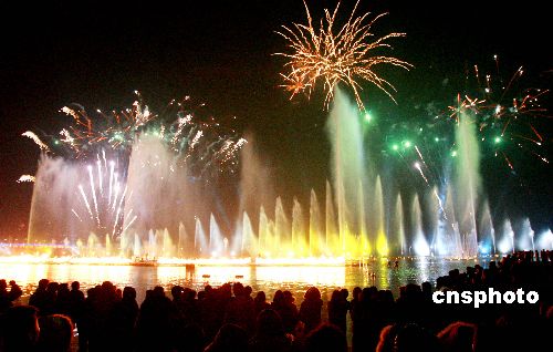 2月8日晚,蘇州金雞湖畔的水景音樂噴泉與璀璨焰火交相輝映。春節(jié)期間,蘇州工業(yè)園區(qū)金雞湖畔每晚一場的大型水景音樂噴泉與焰火表演熱鬧非凡,為節(jié)日之夜?fàn)I造出濃濃的喜慶氛圍,吸引了數(shù)千市民及游客蜂擁而至到場觀看。中新社發(fā) 蘇秀 攝