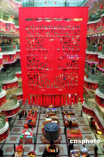 2008年2月9日,沈陽商業(yè)城共享大廳空中高懸有四層樓高、用紅綢布特制的巨大“掛簽”,上面還剪刻了栩栩如生的米老鼠,以歡度新春佳節(jié)。 中新社發(fā) 劉寶成 攝