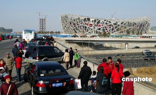 2月10日,位于國(guó)家體育場(chǎng)--鳥(niǎo)巢南側(cè)的北辰橋上大批市民在拍照留念,造成北四環(huán)擁堵。因高架橋上視野開(kāi)闊,角度頗佳,拍照者多將私家車(chē)隨意停在行車(chē)道上,嚴(yán)重影響其他車(chē)輛通行。北京交警隨后趕到將人群疏散,禁止后續(xù)車(chē)輛無(wú)故在此停靠。中新社發(fā) 富田 攝
