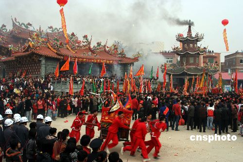 2月10日中午,廈門市同安區(qū)西柯鎮(zhèn)呂厝村四年一次民間民俗盛事--迎“王船”活動吸引了眾多的群眾。當(dāng)?shù)孛癖娦欧畹倪@個王爺叫“代天巡狩”。傳說“代天巡狩”神威顯赫,總能替天行道,愛護(hù)百姓,當(dāng)?shù)孛癖姸己芫囱鏊。因而,到了新舊王爺?shù)慕唤幽辏?dāng)?shù)厝罕姸紩e行“送王”和“迎王”慶典,表達(dá)他們祈平安慶豐收的心情。通常,申子辰年(鼠、龍、猴年)為新舊王爺交接年,交接年間的正月初四為迎接新任王爺?shù)氖,同年的農(nóng)歷十月?lián)袢諝g送原任王爺,形成了四年一任的民間迎送王爺?shù)氖V行律绨l(fā) 吉辛 攝
