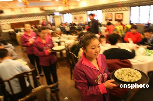 2月11日,北京惠豐餃子樓的服務(wù)員給顧客上餃子。當(dāng)日是農(nóng)歷正月初五,俗稱“破五”,民間素有吃餃子的習(xí)俗。從中午開(kāi)始,北京許多餃子館生意紅火,一些市民通過(guò)吃餃子寄托對(duì)幸福生活和美好明天的期盼。中新社發(fā) 陳曉根 攝