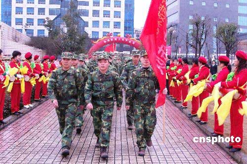 2月25日下午,湖南省郴州市委、市政府、郴州軍分區(qū)舉行盛大儀式,歡送支援郴州抗冰救災(zāi)的部隊官兵離開郴州,數(shù)萬市民冒著細雨前往郴州五嶺廣場為子弟兵送行。中新社發(fā) 賀茂峰 攝