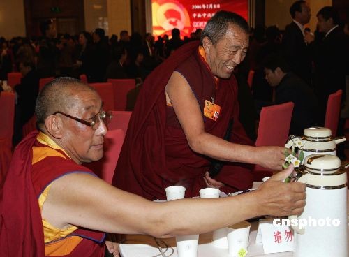 三月三日下午,全國政協(xié)十一屆一次會議在北京人民大會堂隆重開幕,來自西藏的全國政協(xié)委員在會場喝到可口的茶水,深感“賓至如歸”。中新社發(fā) 潘索菲 攝