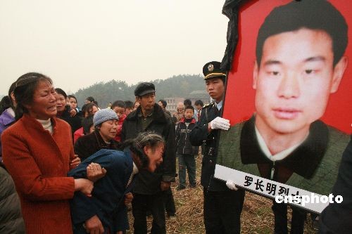 事件回放:2008年1月中旬,湖南省遭遇了50年罕見的冰雪災(zāi)害,電力設(shè)施遭到嚴(yán)重摧毀,羅海文、羅長明、周景華志愿加入到抗冰保電搶險隊伍。2008年1月26日,他們冒著嚴(yán)寒、不顧危險在長沙電廠——沙坪變電站500千伏輸電線路上進(jìn)行人工除冰,因41號、43號、44號鐵塔不堪冰雪重負(fù),相繼發(fā)生坍塌,他們3人隨即從高空墜落,壯烈犧牲。三位英雄壯烈犧牲后,湖南省開展向三位烈士學(xué)習(xí)的活動。湖南省總工會追授他們?yōu)椤昂鲜∥逡粍趧营務(wù)隆睒s譽稱號;共青團湖南省委追授他們?yōu)椤昂鲜∥逅那嗄戟務(wù)聵?biāo)兵”。1月29日上午,國務(wù)院總理溫家寶親臨長沙指揮抗災(zāi)工作時,親自看望慰問了三位英烈家屬。中新社發(fā) 郭國權(quán) 攝