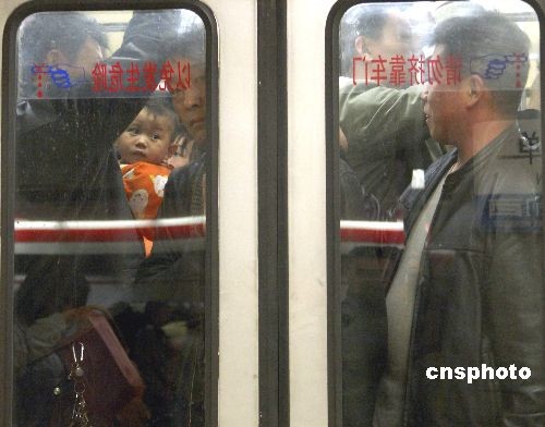 3月10日,北京地鐵里擁擠的人群。根據(jù)統(tǒng)計,北京地鐵在2月29日創(chuàng)下日客運量351萬人次的歷史紀錄。3月7日,北京地鐵全網(wǎng)客運量再創(chuàng)新高,達到359.7萬人次。其中地鐵5號線、13號線、八通線也同時創(chuàng)下各自歷史新高。中新社發(fā) 張朋 攝
