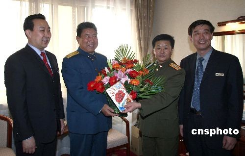 三月十一日,全國政協(xié)委員駐地北京京豐賓館,三十位迎來生日的委員收到駐地工作人員送來的生日鮮花。圖為總后管理局副局長王會軍(右二)、京豐賓館總經(jīng)理劉東衛(wèi)(左一)、京豐賓館書記李如峰(右一),將生日花籃和賀卡送到廣州軍區(qū)原副政委兼廣州軍區(qū)空軍政委朱永清中將(左一)的住房。中新社發(fā) 盛佳鵬 攝