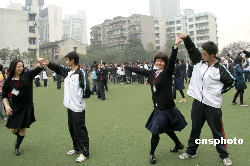 三月十一日,來自日本石川縣、滋賀縣、愛知縣的高中生訪華代表團來到重慶外國語學(xué)校,與中國的高中生開展聯(lián)誼交流活動,圖為中日兩國高中生在校園里翩翩起舞。今年是中日兩國領(lǐng)導(dǎo)人共同確定的“中日青少年友好交流年”,日本此次訪華的青少年友好使者代表團一行共一千人,分赴上海、重慶、廣州、成都、杭州、大連等地訪問交流。中新社發(fā) 孫自法 攝