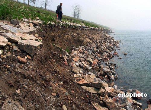 2008年3月18日,枝江市白洋鎮(zhèn)向家壩沙灣堤外垸,崩塌的長江堤防。據(jù)悉,自3月10日以來,湖北枝江市白洋鎮(zhèn)向家壩沙灣堤外垸長江堤防連續(xù)發(fā)生崩塌。該處垸堤長1750米,崩長360米,崩坎平均高1.5米至3.5米,最高處達(dá)5米;垸內(nèi)有14戶人家,耕地183畝。據(jù)專家分析,該堤段崩岸主要原因是:一、清水下泄,崩岸處正處清江河口對岸,迎流頂沖,護(hù)坡腳槽形成吊坎后崩垮;二、長江近年處在中低水位運行,護(hù)坡處淤沙沖失后未及時維護(hù)。目前,枝江正在組織勞力、機(jī)械、石源對該段進(jìn)行突擊整治,力爭汛前全面脫險。中新社發(fā) 劉君鳳 攝