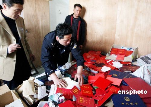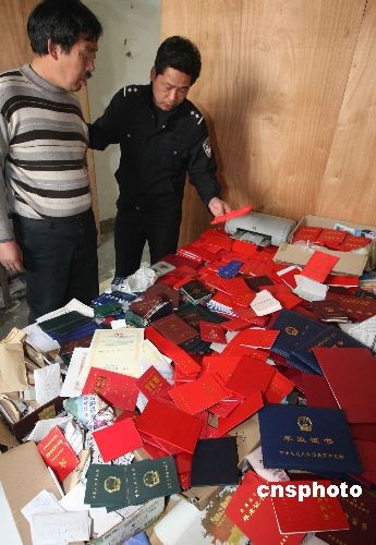 3月19日,河南洛陽警方在一民宅內(nèi)將一伙制造假證的犯罪集團逮個正著。行動中查獲各類假證7大類145種共計10000多份,現(xiàn)場還查獲印章、鋼印、電腦、打印機等一批制假造假設備。在事實面前,犯罪嫌疑人對犯罪事實供認不諱。中新社發(fā) 曾憲平 攝