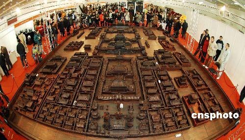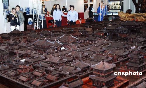 3月20日,為期5天的“第六屆全國工藝品、旅游品、禮品博覽會暨第十一屆春季(大連)中國古玩藝術(shù)品博覽會”在大連星海會展中心舉行。在展會西廳區(qū),一個一展現(xiàn)古都風(fēng)貌喜迎2008年奧運會為創(chuàng)作宗旨的按正式比例縮小120倍的紫檀巨雕故宮全景,吸引了眾多市民的眼球。這個作品9米長,寬7米,總面積60余平方米,由50余位高級技師歷時6年精心雕制而成。該作品無論從用料、耗時都令人稱絕。如此大型紫檀木雕藝術(shù)作品也實屬罕見。中新社發(fā) 劉德斌 攝