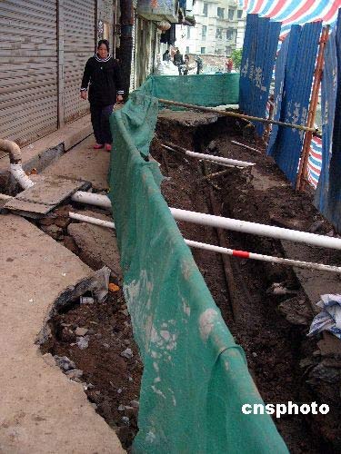 3月21日,湖北宜昌城區(qū)力行二街35號8層高的住宅樓豐澤苑地基發(fā)生陷塌后的現(xiàn)場,施工方已將陷塌物部分清理后準備對地陷進行加固。據(jù)悉,3月19日晚,宜昌城區(qū)力行二街35號8層高的住宅樓豐澤苑地基突然發(fā)生陷塌,一些居民連夜撤離;陷塌處長約10多米,寬約5米。居民們認為,豐澤苑住宅樓5米外的地方有一塊正在開發(fā)的地基已挖了10多米深,正因這處較深的地基與豐澤苑住宅樓地基太近,才導(dǎo)致出現(xiàn)了陷塌險情。豐澤苑住宅樓于2001年建成,住有40多戶居民(其中,一樓為商業(yè)門面),一個多月前,塌陷處的表面就已發(fā)現(xiàn)裂縫,施工人員曾對裂縫處作過灌漿處理。中新社發(fā) 劉君鳳 攝