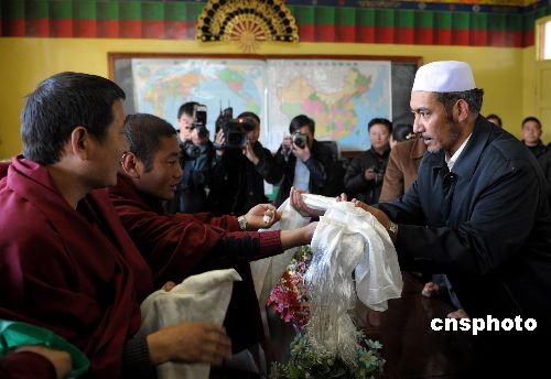 3月22日,拉薩大昭寺僧人走訪拉薩大清真寺并向該寺阿訇獻哈達。中新社發(fā) 廖攀 攝