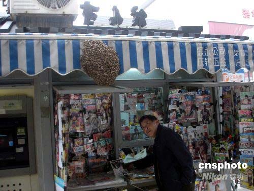 4月13日,蘇州人民路上一家信息亭的遮陽棚上聚集了大量的黃蜂,嚇得路人躲而避之。據(jù)悉,當(dāng)日中午12點左右遮陽棚上還只是幾只黃蜂,后來越積越多,至下午5時左右已形成一個巨大的黃蜂窩,蜂窩直徑達40厘米,厚度也達4厘米,晚上9時左右黃蜂窩被消防官兵成功摘除。據(jù)行家分析,其原因可能是中午蜂王停在了信息亭的遮陽棚上,才引來大量的黃蜂聚集在了一起。中新社發(fā) 王建康 攝