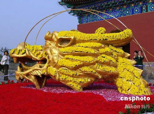 4月18日,金碧輝煌的中國龍?jiān)煨驮邗r花簇?fù)碇谐霈F(xiàn)在天壇公園西下坡花壇,表現(xiàn)出龍騰盛世的宏大場面。 這是天壇公園為迎接4月20日開始的北京國際馬拉松賽精心設(shè)計(jì)的。設(shè)計(jì)立意采用天壇祭天神樂禮器“麾”的造型,麾是韶樂演奏時(shí)用來傳達(dá)音樂起始的號(hào)令,其立意在于體現(xiàn)馬拉松測試賽吹響了即將到來的奧運(yùn)號(hào)角。中新社發(fā) 九州 攝