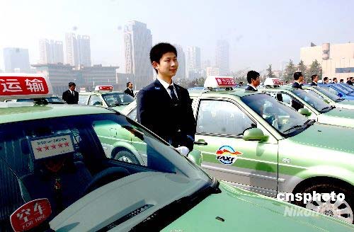 4月29日,青島開發(fā)區(qū)近百名出租車司機隆重集會,啟動以“文明窗口在流動”為主題的迎奧運文明品牌創(chuàng)建活動。該區(qū)的出租車司機們提出了“參與奧運,服務奧運,奉獻奧運”的口號,共同倡議“八個文明”,即車容文明,儀表文明,語言文明,行車文明,服務文明,安全文明,綠色文明,管理文明。中新社發(fā) 衛(wèi)卿 攝