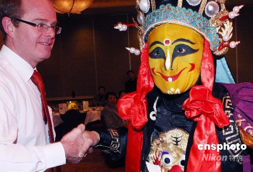 5月6日晚,在北京舉行的中外商貿(mào)合作項(xiàng)目洽談酒會(huì)上,來(lái)自四川的著名變臉?biāo)嚾藶榧钨e現(xiàn)場(chǎng)進(jìn)行精彩的“變臉”,表演受到在座外國(guó)賓客的熱烈歡迎。中新社發(fā) 錢(qián)興強(qiáng) 攝
